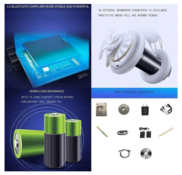 Sobre este artículo★【Calidad de sonido impactante】: la fuente de sonido del tambor de jazz, la batería y la posición del ymbal son precisos, el sonido del tambor es y el sonido ymbal es natural y claro, lo que inspira tu pasión continua por practicar la batería.★ El súper sonido puede ser comparable al tambor de jazz de alta calidad. La increíble calidad de sonido te da una sensación de audición sin igual.★【Material de silicona】: instrumento musical de silicona de grado alimenticio, sílice específica para instrumentos, respetuoso con el medio ambiente, seguro, certificado por instituciones profesionales. Impermeable, fácil de limpiar, simplemente limpia con un paño húmedo para restaurar la limpieza. Cómodo al tacto.★【Portátil, accesorios completos】: el tambor suave es portátil, plegable y ligero, ahorrando espacio. Practica la batería en cualquier momento y en cualquier lugar. El juego de batería plegable contiene una gran cantidad de accesorios, como cables USB, auriculares, baqueta, pedales dobles, etc.★【Conexión inteligente】: este tambor se puede conectar a un teléfono móvil, computadora o altavoz utilizando Bluetooth o línea de datos, compatible con múltiples plataformas. El modo de altavoz y el modo de auriculares se cambian a voluntad. Altavoces estéreo, ritmo y volumen son ajustables.